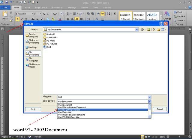 برای اینکار شما باید بعد از باز کردن وورد 2010 قبل از هر کاری صفحه باز شده را طبق شکل زیر به صورت word 97- 2003Document ذخیره نمایید.